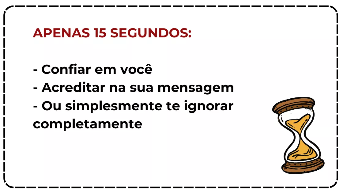 E sabe o que as pesquisas mais recentes revelaram? Você tem apenas 15 SEGUNDOS — sim, apenas 15 míseros segundos — para fazer alguém decidir se vai: