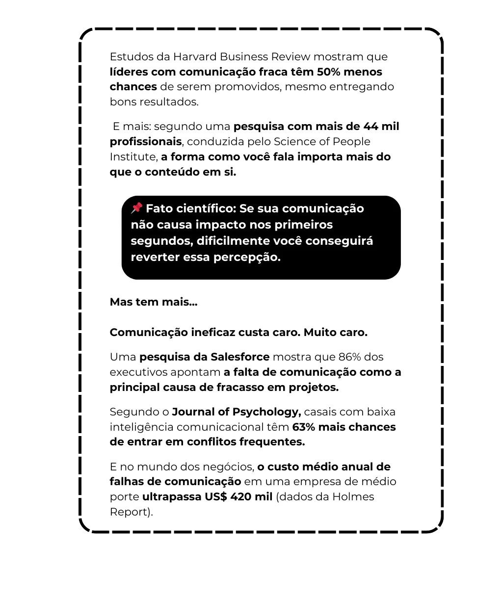 Estudos da Harvard Business Review mostram que líderes com comunicação fraca têm 50% menos chances de serem promovidos, mesmo entregando bons resultados.