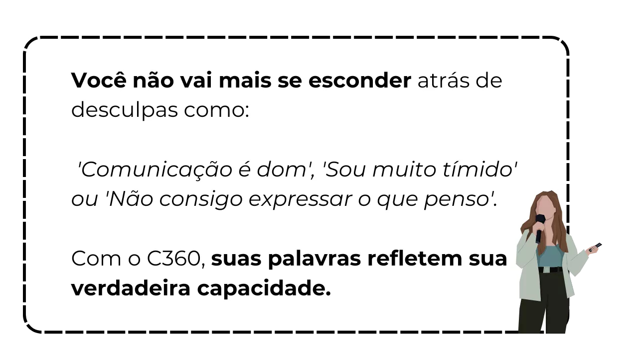 Hoje, depois de aplicar as técnicas do comunicador 360, isso mudou. Agora sei me posicionar e o que dizer... me voluntariei para discursar , no aniversário da empresa! Algo que seria impossível antes. Falei na frente de vários colegas de trabalho e falei de maneira intencional. Vi pessoas se emocionarem com o que eu disse. Foi libertador."